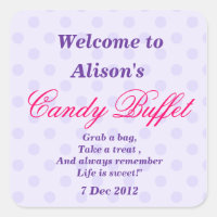 A purple and pink square-shaped card with a polka dot pattern in the background. The card has a large, cursive 'W' at the top left corner, followed by the text 'Welcome to Alison's Candy Buffet'. Below this, there is a smaller text that reads 'Grab a bag, take a treat, and always remember, life is sweet!' with the date '7 Dec 2012' at the bottom right corner. | Purple Dotty Candy Buffet Party Sticker | 90029ccb807556feafd9e0dd46b5a7e228934091ec9b8bf891d7ddde01c98a28 | 001229724406 | 0 | 0 | 67 | 6 | 0 | 0 | |