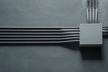 A close-up view of a wall-mounted electrical box with multiple wires connected to it. The box is rectangular with a hinged cover, and the wires are attached to the box using screws. The wires are of various lengths and are neatly arranged, with some wires extending upwards and others downwards. The wall is a dark color, and the lighting is soft, casting a shadow to the right of the box. | Box Of Transformer On Gray Wall | a1a675bbf9ee4c7c2cf04e06cad60d4583e206744a3ee6b3c2b52c043aa8152d | 001229724762 | 0 | 0 | 70 | 6 | 0 | 0 | |