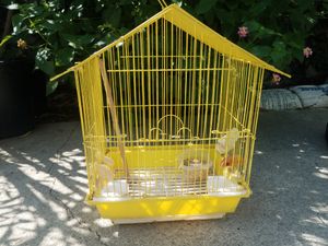 A yellow birdcage with a pointed roof and a door is placed on a concrete surface. Inside the cage, there is a small bird figurine, a pink and white bird toy, and a small bowl with a pink object. The cage is surrounded by green foliage, and there is a shadow cast on the ground. | Used birdcage for Sale in Irwindale, CA | 69f643bf330c60d55d9bf02338348de14e174fa6e2d5a41176d63140301e5bea | 001229724753 | 0 | 0 | 55 | 7 | 0 | 0 | |
