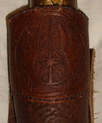 A brown leather belt with a circular emblem in the center, featuring a sword-like design with a crossguard and a hilt, is displayed against a white background. | Lightsaber Sheath Detail by MissLizz | 7db74e68d1837ff5ffc7654293355794472a763e5752baa4841ee075c7bf80db | 001229725166 | 0 | 0 | 27 | 5 | 0 | 0 | |