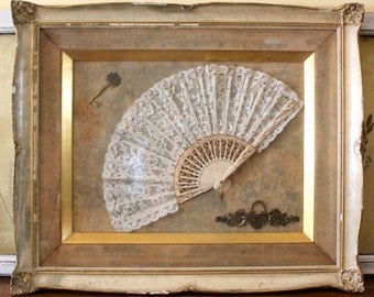 A vintage fan with intricate lace details is displayed in a frame. The fan is positioned in the center of the frame, with a key and a decorative element resembling a bow tie or a flower on the bottom right corner. The frame has a gold border and is mounted on a wall. | Vintage Fan, Lock, and Key | d6b5f2066b5253043c1a18de34425de535ec6752c8e2654a0008ba0de35fb013 | 001229724875 | 0 | 0 | 53 | 5 | 0 | 0 | |