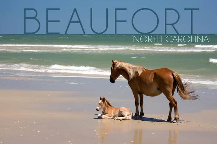 A brown horse and a small foal are standing on a sandy beach with the ocean in the background. The horse is on the left, and the foal is on the right. The water is calm, and the sky is clear. The text 'BEAUFORT' is visible in the top left corner, and 'NORTH CAROLINA' is written in the top right corner. | Our Happy Place-Beaufort *Pet Friendly* | 5a4e60ea8381483ff1d6fc881ab318e7cba893e2a58055c2e8bbb52e923732a7 | 001229725269 | 0 | 0 | 61 | 5 | 0 | 0 | |