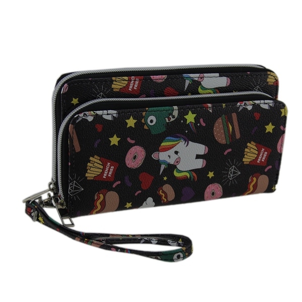 A black and white patterned wallet with a unicorn design on the front, featuring a rainbow mane and tail, and surrounded by stars, hearts, and other whimsical elements. The wallet has a zipper closure and a strap with a patterned design. | All the Favorite Things Fun Food and Unicorns Wallet with Removable Strap | ac47facd997740123cc5660e77fe930a325f8ccdf056f6f9898e451896230aca | 001229725311 | 0 | 0 | 41 | 12 | 0 | 0 | |