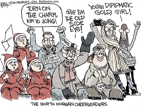 A comic strip depicting a group of people in a cheering section with various expressions and poses. The top panel shows a person with a megaphone saying 'Turn on the charm, Kim Yo Jong!' and another person with a camera saying 'Give 'em the old side-eye!'. The middle panel shows a person with a sign that says 'NYT' and another person with a sign that says 'CNN'. The bottom panel shows a person with a sign that says 'MSNBC' and another person with a sign that says 'FOX'. The characters are all wearing winter clothing and are seated or standing in a row, with some holding | North Korean Cheerleaders | 504e3d3b8a6f283a136efb28149906c1be5f856e21e94d47aeec9566b47cef39 | 001229725296 | 0 | 0 | 106 | 3 | 0 | 0 | |