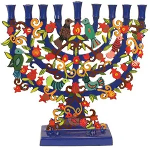 A colorful ceramic Hanukkah menorah with blue and brown tones, featuring a variety of birds, fish, and other decorative elements. The menorah has nine branches, each with a blue candle holder, and is set against a white background. | Yair Emanuel Large Blue Menorah with a Tree Design and Birds in Lazer-Cut Metal | 34e414400102df0cce92eda5fbef671737018e8705c5aee601604f16218d5714 | 001229725289 | 0 | 0 | 38 | 14 | 0 | 0 | |
