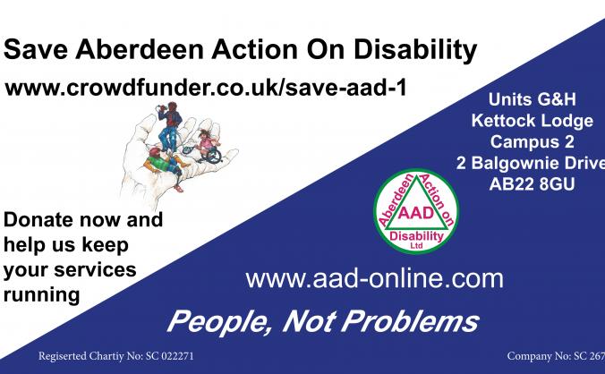 A promotional poster for a charity event titled 'Save Aberdeen Action on Disability'. The poster features a hand with a group of people inside it, representing the charity's mission to help people with disabilities. The poster includes a call to action to 'Donate now and help us keep your services running' and a website URL 'www.aadonline.com'. The event is taking place at the 'Kettles Lodge, University of Aberdeen, Kings College Campus, AB24 2TZ'. | Save aberdeen action on disability image | 1444b0e0b7fa85cc21aebc72955ac6dd0419db46880373ee4f95ce704675fcca | 001229725208 | 0 | 0 | 73 | 6 | 0 | 0 | |