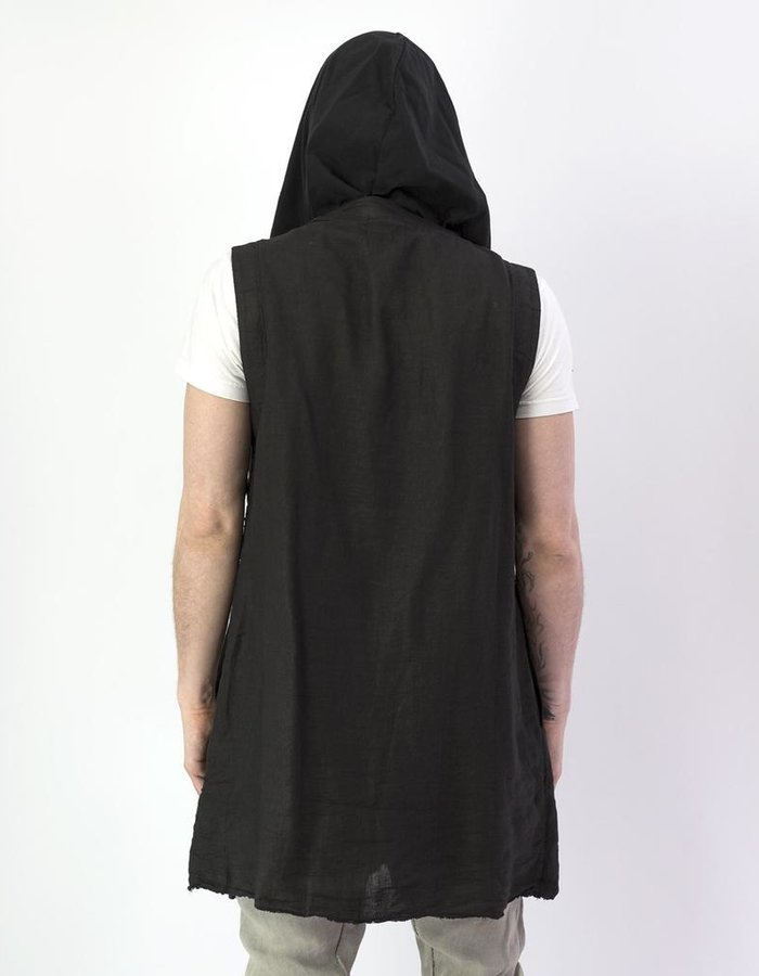 A person is standing with their back to the camera, wearing a black vest over a white shirt. The vest has a zipper and is made of a smooth, dark fabric. The person is wearing beige pants and has a tattoo on their right arm. The background is a plain, light-colored wall. | ANDREA YA\xe2\x80\x99AQOV LINEN VEST :BLACK | d73d2dfcc8825cf9a7152e7b16198373394098f8440c09462508a751911bfccb | 001229718026 | 0 | 0 | 52 | 5 | 0 | 0 | |