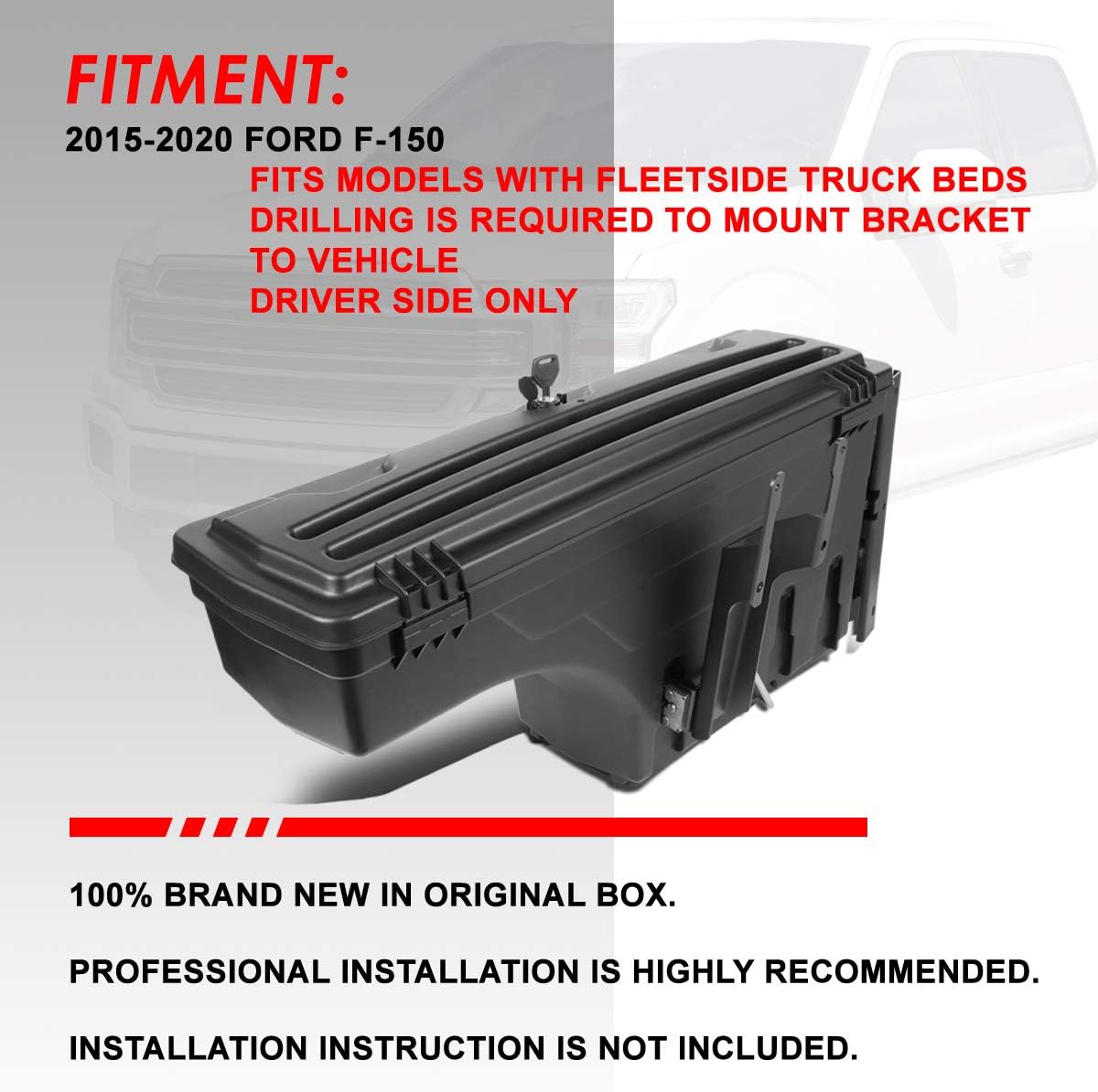 A black and white advertisement for a Ford F-150 truck bed cover. The cover is described as a 'Fits models with flateside truck beds' and is 'Required to mount bracket to vehicle'. The advertisement includes a statement that the cover is '100% brand new in original box' and that 'Professional installation is highly recommended. Installation instruction is not included.' The image features a close-up of the truck bed cover with a white background and red text. | Driver Side Truck Bed Wheel Well Storage Case Tool Box Replacement for Ford F-150 15-20 | f21cee3a6715acfb30a8aae5578838c31175e9a44b4d5027e9df9195a8768ea2 | 001229717979 | 0 | 0 | 76 | 15 | 0 | 0 | |