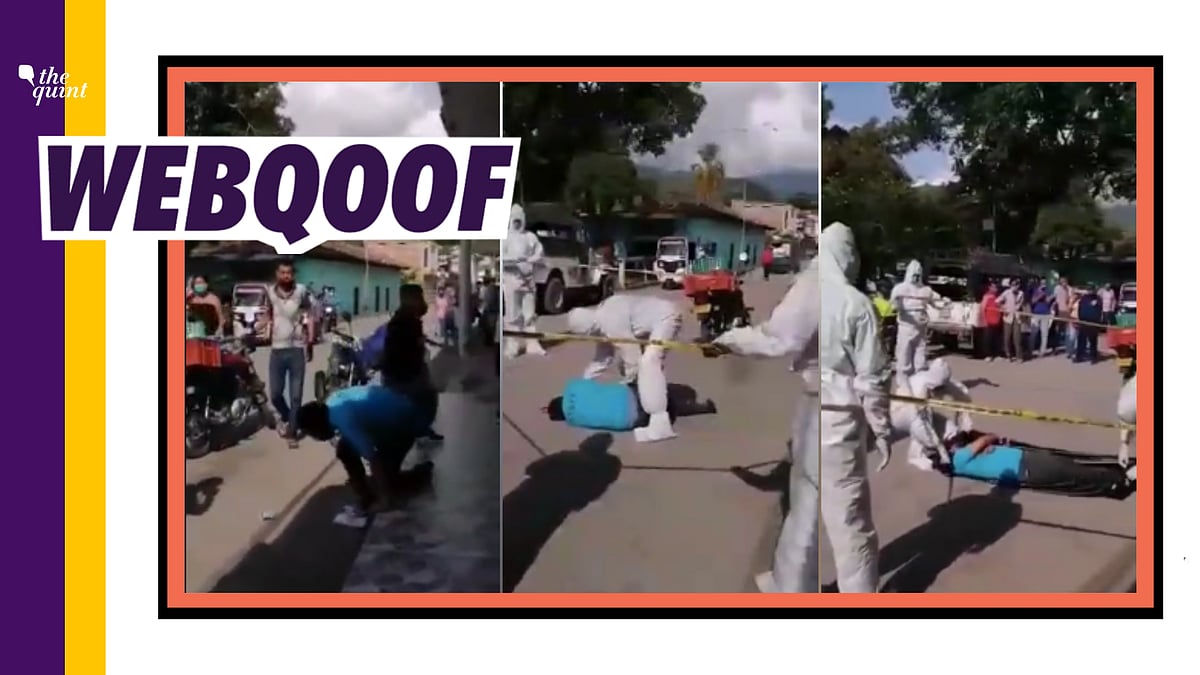 The first image shows a chaotic scene with multiple people in hazmat suits and masks, some of whom are holding ropes. In the center, a person in a blue shirt is kneeling on the ground, seemingly in distress. The image is overlaid with the text 'WEBBOOF' in large, bold letters. | Video of COVID-19 Mock Drill in Colombia Shared as Real Incident | a83244ca4407012e534f56ad1ef5a4779c842d88a2bbc5674882105fbaa67348 | 001229725843 | 0 | 0 | 50 | 11 | 0 | 0 | |