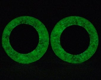 Two glowing neon green circles are placed side by side against a dark background. | 15mm Glow In The Dark Eyes, Metallic Green Safety Eyes With Green Glow, 1 Pair Of Glow In The Dark Safety Eyes | 5ac6cb3778d861b7be25fdf38df3bb0bbfc3da01d3ac3797a8b849eb2585aa3a | 001229725716 | 0 | 0 | 14 | 22 | 0 | 0 | |