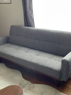 A modern, grey fabric sofa with a low profile and a wooden base is placed on a wooden floor. The sofa is positioned against a wall with a large window covered by grey curtains. The room has a minimalist design with a simple rug underneath the sofa. | MCM Mid Century Modern Grey Futon Sofa Couch for Sale in Long Beach, CA | a5985585744f0ce963dd91d8714165764bb2a1aab225dee87ae60b359163911e | 001229725948 | 0 | 0 | 47 | 14 | 0 | 0 | |