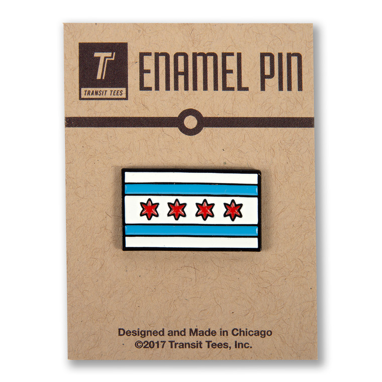 A pin featuring a stylized representation of the Chicago flag with a blue field and a white star in the center, surrounded by a red border with a white stripe at the bottom. The pin is displayed on a cardboard background with a brown texture and the words 'TENAMEL PIN' at the top. Below the pin, there is a text block that reads 'DESIGNED AND MADE IN CHICAGO' followed by the copyright information '2017 TRANSIT TEES, INC.' | Chicago Flag Icon Enamel Pin | b6307cd6508e37bcbdf8055dfa8f15176f45c0e8f72273efa6fdaa2e7afa17c9 | 001229726274 | 0 | 0 | 77 | 5 | 0 | 0 | |