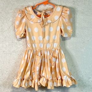 A yellow polka dot dress with a white collar and cuffs is hanging on a hanger against a white background. The dress has a fitted bodice with short sleeves and a full skirt with multiple ruffles. The polka dots are white and evenly spaced across the fabric. | GIRL HOOD Girl's Dress Size 5T Fit Flare Ruffles Pokadots Very Stretchy Terylene | b789ca9e69e6ec365d856eb73d93564c4f7262666f87339910aa630a1193c877 | 001229726371 | 0 | 0 | 47 | 13 | 0 | 0 | |
