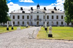 A large, white, two-story building with a blue roof and multiple chimneys is surrounded by a lush green lawn. In front of the building, there is a gravel path leading to the entrance, flanked by rows of white statues on pedestals. The statues are evenly spaced and appear to be of various designs. The building has a prominent central entrance with a balcony and a large arched doorway. The sky is clear with a few clouds, and there are trees to the left of the building. | Mansion in Sweden. Luxurious estate in sweden in a town called gimo a sunny day Royalty Free Stock Photos | 56dc4c7f445137ffccd542b5ceccd499f32139dc26326527ddd568ddb2370aeb | 001229726464 | 0 | 0 | 86 | 19 | 0 | 0 | |
