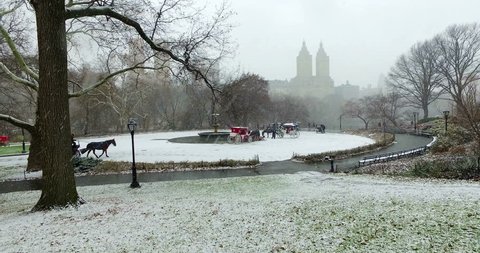 A snowy park scene with a carousel in the center, surrounded by people in winter clothing. The trees are bare, and the ground is covered in snow. The sky is overcast, and the Empire State Building is visible in the background. | Beautiful Ultra HD cinematic video of Central Park in New York covered in snow. People taking a romantic tour with a horse and carriage moving through the snow while enjoying the panoramic lansdscape. | d599ff8b7e103c075552c8674fe33444cb74e851bd132b1109b8fa89420713d8 | 001229726963 | 0 | 0 | 41 | 33 | 0 | 0 | |