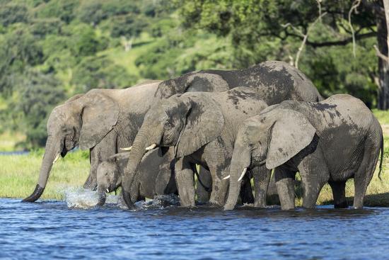 A herd of elephants is gathered around a watering hole in the African savannah. The elephants are of various sizes, with some being larger and others smaller, indicating a mix of ages. They are standing in the water, with some spraying water onto their backs, and others drinking from the water's edge. The background features a lush green landscape with trees and a clear sky. | African Elephant Herd, Chobe National Park, Botswana-Paul Souders-Photographic Print | 2656f3ab3bd40ba10b50d980303e8687efa227be80d7f68e7b400ece6e48e74d | 001229726893 | 0 | 0 | 65 | 9 | 0 | 0 | |