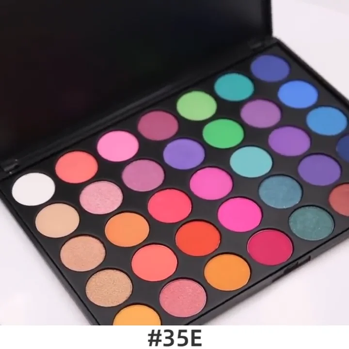A compact makeup palette with a variety of colors is open, displaying a rainbow of shades. The palette is black with a clear plastic lid, and the colors are arranged in a pattern that resembles a gradient. The colors range from light pastels to deep jewel tones, and the palette is labeled '35E' in white text at the bottom. | Eyeshadow Palette Cosmetic Makeup 35 Color Glitter Waterproof Metallic Eye | bc0175c6535766720f6610e421bdcc2a15c43808b6240828ea819e6b624e36d5 | 001229726903 | 0 | 0 | 59 | 10 | 0 | 0 | |