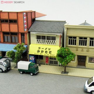 A miniature model of a street scene with a variety of buildings, including a red building with a sign that reads 'Cafe', a yellow building with a sign that reads 'Nihon Shokudo', and a beige building with a sign that reads 'Nihon Shokudo'. There are two trees, one on the left and one on the right, and a green truck on the left side of the street. The scene is set on a textured surface that resembles a road, and there is a small white car on the right side of the street. | Sankei MP03-06 Japanese Shop A 1//150 N scale | 07ab0b21aae2a7469bb573548f4aa6b3bd763d8ffda2ca7b87d800ce26eab50d | 001229726945 | 0 | 0 | 93 | 8 | 0 | 0 |