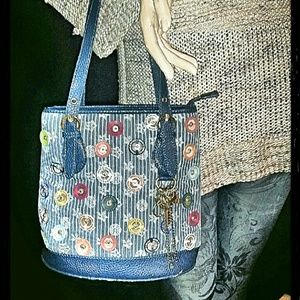 A blue handbag with a floral pattern and a silver zipper is being held by a person wearing a beige sweater and black pants. | Handbags - Trunks & Bags Hobo | b2843abf7a6c6970abd5f27a728ee01422181efac3f0c3362f08a600f5200896 | 001229727675 | 0 | 0 | 24 | 6 | 0 | 0 | |