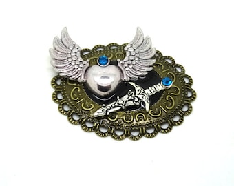 A silver brooch with a heart-shaped design and two wings on either side is displayed against a white background. The brooch features a blue gemstone in the center of the heart and a silver sword with intricate designs on the right side. The brooch is set against a circular pattern with a dark border. | Pendant lace winged heart, elven dagger | 94c6dcbef3590a2c34b345ea19b50e93e4de3693b7b1b671d16cc891410f826c | 001229727499 | 0 | 0 | 54 | 6 | 0 | 0 | |