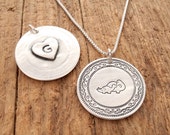A silver heart-shaped pendant with the letter 'G' engraved in the center is hanging from a chain, placed on a wooden surface. Next to it, there is a silver circular pendant with a detailed design featuring a ghostly figure and a tree. | Personalized Mother and Baby Dinosaur Necklace, Heart Monogram, Fine Silver, Sterling Silver Chain, Made To Order | ea56b659fb0ca85b73977a6f8cd3d989c4dafdb6fd49c1321790649a07bf99da | 001229727543 | 0 | 0 | 42 | 16 | 0 | 0 | |