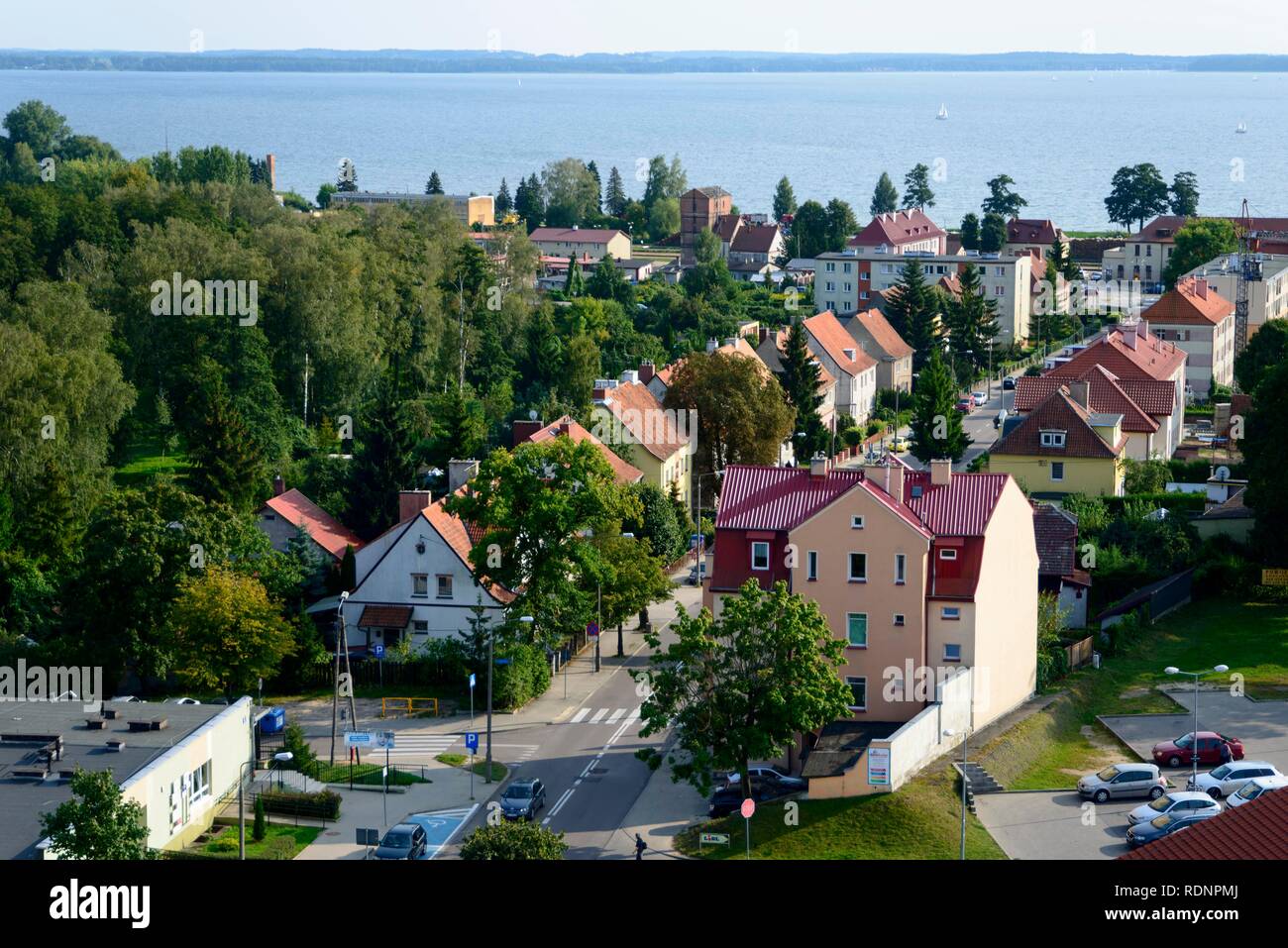 Aerial view of a small town with a mix of red and yellow buildings, surrounded by green trees and a body of water in the background. The town has a grid-like street pattern with cars parked along the sides. There are several boats on the water, and the sky is clear. | View from the water tower, Lake Niegocin, Gizycko, Warmia-Masuria, Poland Stock Photo | 9c34ee149666091f6f52883feded500e1976908a3f2fa108e2603c59683fe922 | 001229727697 | 0 | 0 | 51 | 12 | 0 | 0 | |