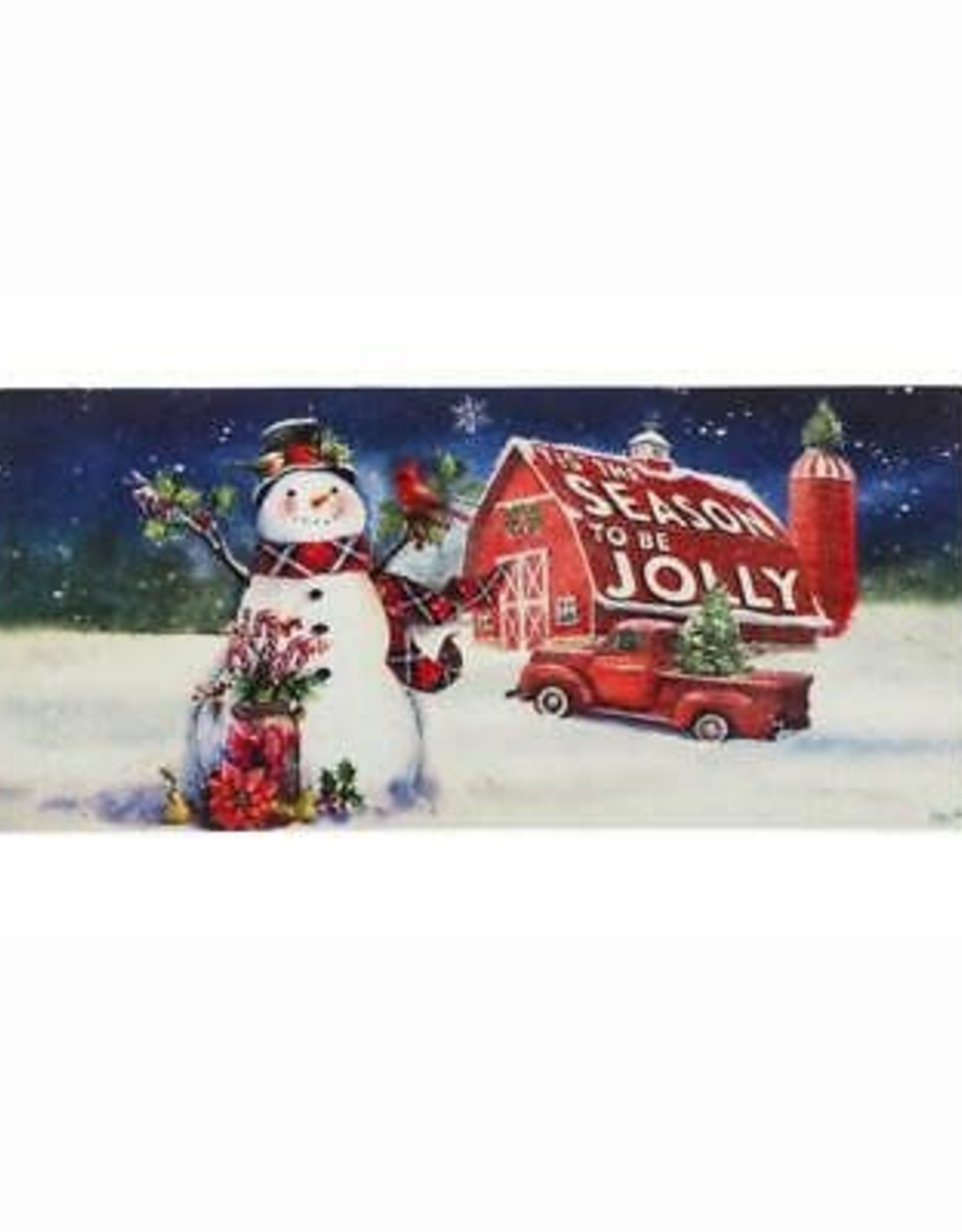 A festive winter scene with a snowman wearing a Santa hat and a red scarf, holding a red bow, standing in front of a red barn with the words 'Season to be Jolly' on it. A red vintage car is parked in front of the barn, and there are snow-covered pine trees in the background. The sky is dark with stars, and there are snowflakes falling. | Christmas Barn Snowman Switch Mat Insert | f76d4187165e90a0418e9aaba3514797f23d6bc894c649e0ad065cc0cf49370f | 001229727791 | 0 | 0 | 66 | 6 | 0 | 0 | |