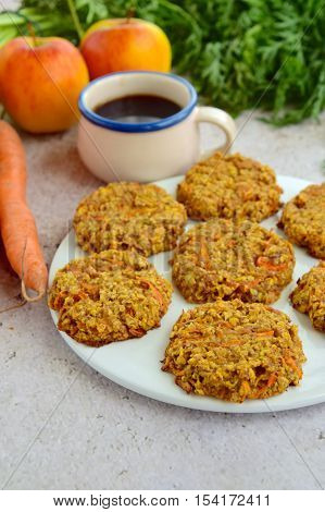 A plate of carrot and oatmeal cookies is on a table, accompanied by a bowl of coffee and a bunch of carrots. | Homemade chewy carrot apple oat breakfast cookies | af1fb04430ec0a627aa06d1a3d9f94213b81f1831a97d3fab10bc09dce565e99 | 001229727829 | 0 | 0 | 22 | 7 | 0 | 0 | |