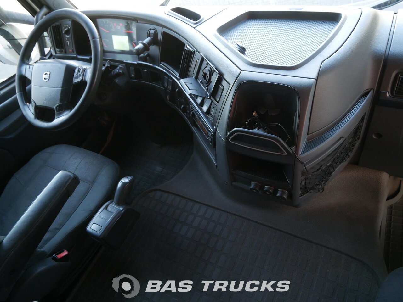 The interior of a vehicle with a black dashboard and a steering wheel on the left side. The dashboard has various controls and a digital display. There is a gear shift lever on the center console, and the floor is covered with a black carpet. The word 'BAS TRUCKS' is visible on the floor. | photo of Used Tractorhead Volvo FH 460 XL 4X2 2012 | a9566ea22983fc17a5cf42e33e0b1e8695919c13ea862e9a4586b2b12f295b88 | 001229727741 | 0 | 0 | 54 | 10 | 0 | 0 | |