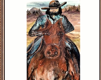 A painting of a man in a cowboy hat riding a horse. The man is wearing a blue shirt and a brown vest, and the horse has a brown mane and tail. The painting is framed and has a textured appearance, with visible brush strokes and a slightly faded look. | Rough Rider A Western Watercolor Print By Joyce Lee | 8e381ee8f844b7288684dab85a0119ec13d4c726c3944a6fa047dbf1057460a6 | 001229728245 | 0 | 0 | 50 | 9 | 0 | 0 | |