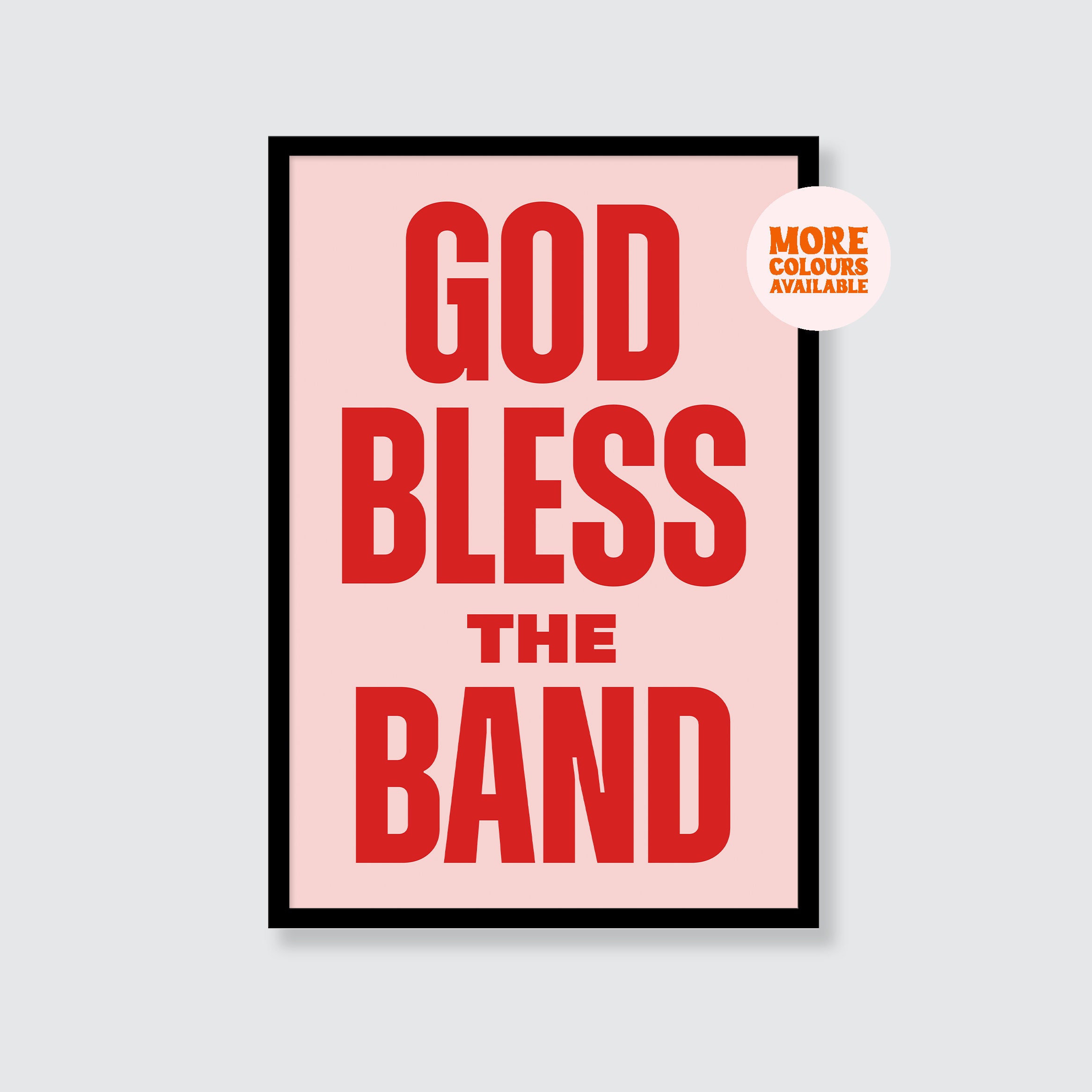 A red poster with white text that reads 'GOD BLESS THE BAND' in a bold, stylized font. The poster has a white border around it, and there is a small orange sticker with the text 'MORE AVAILABLE' in the top right corner. | Courteeners wall art God Bless The Band print | 66cc9d0cbbec6c908e5b13a6830df7d67e7ed817f453521ae6f2e7b46ca756f2 | 001229728271 | 0 | 0 | 42 | 8 | 0 | 0 | |