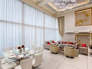 A spacious living room with a large window covered by sheer curtains, allowing natural light to illuminate the room. The room features a modern dining area with a glass table set for four, complete with plates, glasses, and a centerpiece of red roses. The seating consists of white chairs with red cushions. A comfortable-looking sofa with red cushions is positioned against the wall, accompanied by a matching armchair. The floor is tiled, and the walls are adorned with framed artwork and a decorative ceiling light fixture. | Sand Dunes Pent House : Living room by Mahesh Punjabi Associates | c22d9bff206d6d894f4ba03012e79ef3a4f6413c8b9dfbd4c75e84bc94d6832c | 001229728407 | 0 | 0 | 86 | 11 | 0 | 0 | |