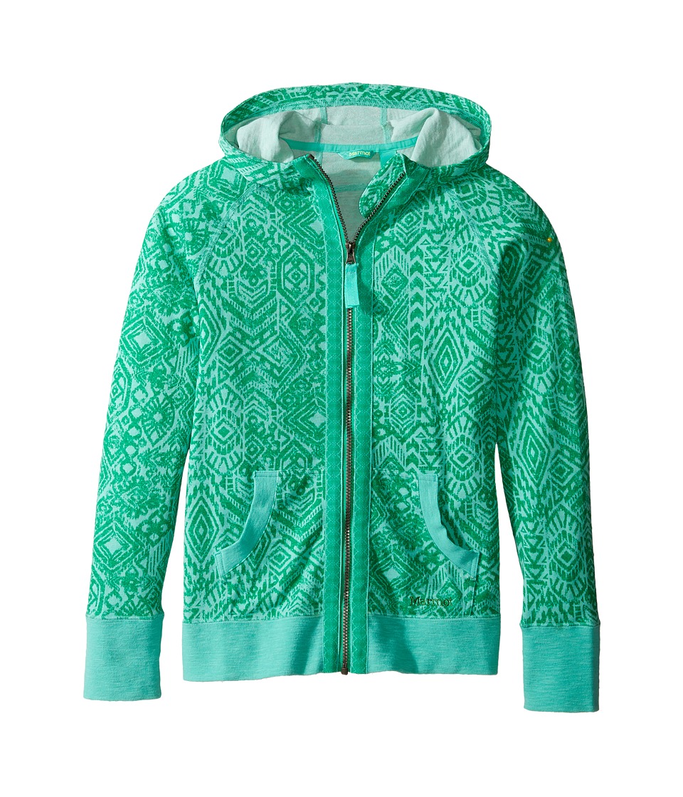 A green hoodie with a zipper and a hood, featuring a pattern of interlocking hexagons in various shades of green. The hoodie has a front pocket with a zipper and a small logo on the upper left side. The sleeves have cuffs, and the overall design is casual and comfortable. | Marmot Kids - Sadie Hoodie (Little Kids/Big Kids) (Celtic) Girl's Sweatshirt | 5aab0affe34f596db2465bb202b8ea409840b20aca6933c3ecd483a93f814310 | 001229728465 | 0 | 0 | 50 | 11 | 0 | 0 | |