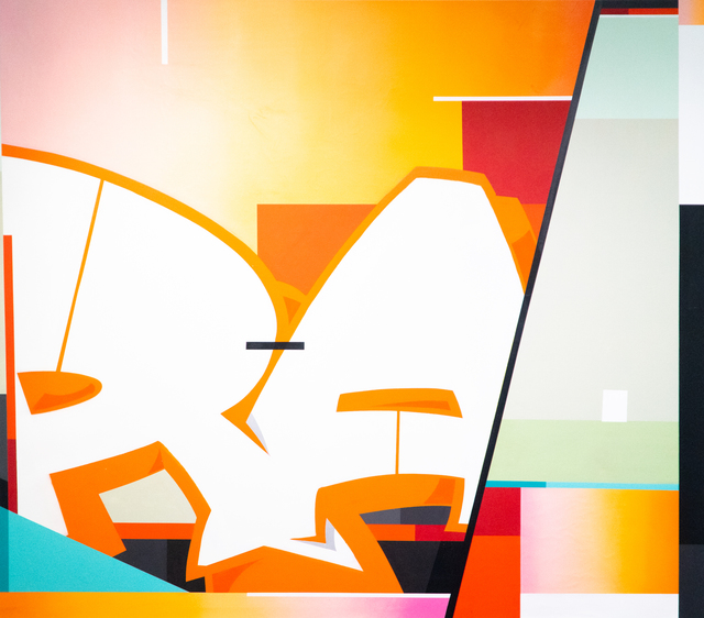 The first image depicts a vibrant abstract painting with a focus on a large, three-dimensional graffiti-style letter 'R' in the center. The background features a gradient of warm colors transitioning from yellow to orange, with geometric shapes and lines that give the impression of a cityscape or urban environment. The painting is rich in color and texture, with a sense of depth and dimensionality. | RAWS, \xe2\x80\x98Untitled\xe2\x80\x99, 2019, Urban Spree Galerie | 6ac3cfad8f6fe0d84a20bc98dba7a66b8fb63ad373532dadf16daf22e9669ead | 001229729880 | 0 | 0 | 64 | 6 | 0 | 0 | |