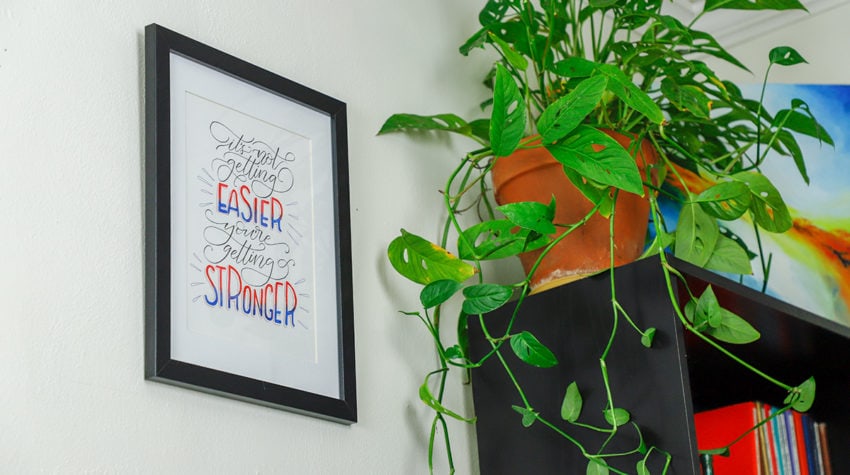 A framed picture of a colorful abstract painting is hanging on a wall next to a potted plant with green leaves. | Watercolor brushed quote framed and hanging on wall with plant. | 0a1efb0512f8f17361d3e56085a82379da9251bda935edd03732d4f4ff34aca7 | 001229729957 | 0 | 0 | 21 | 10 | 0 | 0 | |