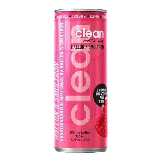 A can of Clean Energy drink with a pink label featuring the brand name 'Clean' and the tagline 'Halton Smalttron'. The can has a silver top and bottom, and the label includes various nutritional information and ingredients listed in different languages. | Clean Drink BCAA Hallon/Smultron 330ml | 48466e96c22dfc6b7c9936ed6204907e7295d2c1091ae8f307395c2b323905d0 | 001229729768 | 0 | 0 | 41 | 5 | 0 | 0 | |