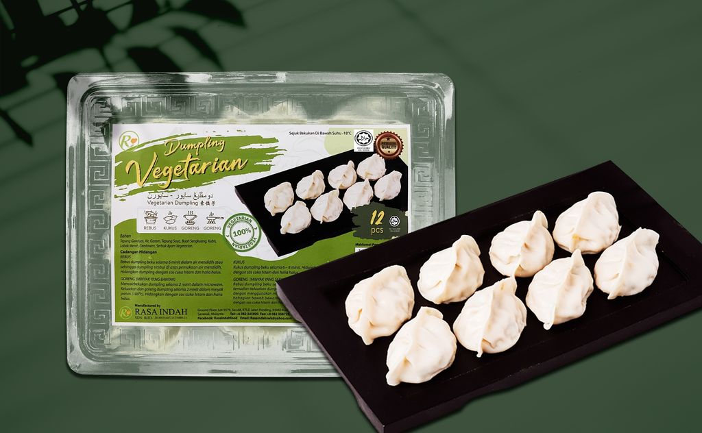 A package of frozen dumplings with a label that reads 'VEGETARIAN' and 'VEGETARIAN DUMPLINGS' is placed on a green surface. The package is transparent, showing the dumplings inside, and there is a black tray with a dozen dumplings on top of it. The tray is also on the green surface. | Vegetarian Dumpling_Halal.jpg | 24aa93f5b80f6a38f4f9d24f78a72bf43e1609f583b651f38462d0807e7754fc | 001229729917 | 0 | 0 | 50 | 2 | 0 | 0 | |