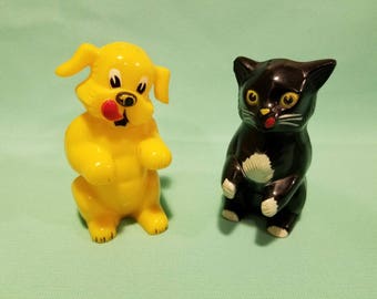 A yellow and black vintage toy dog and cat figurine are displayed on a teal background. The dog is on the left, with a yellow body, black ears, and a black nose, and is holding a red apple in its mouth. The cat is on the right, with a black body, white chest, and yellow eyes, and is sticking out its tongue. Both figurines have a glossy finish and are positioned side by side. | Great, vintage 50\xe2\x80\x99s, plastic, F&F, yellow dog and black cat, salt and pepper shaker set! | 0b5e5b47aef60b859c1b1ed61dd12ecb756b5539b43b612568910765da9a3009 | 001229729645 | 0 | 0 | 74 | 15 | 0 | 0 | |