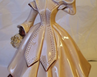 A porcelain figurine of a woman in a Victorian dress with a full skirt and a bodice adorned with lace and buttons. The dress is predominantly beige with a darker shade at the waist and a lighter shade at the hem. The woman is holding a bouquet of flowers in her left hand, and there is a single flower attached to her dress. The figurine is set against a white background. | Florence of California Ceramics Lady Figurine Matilda | 5ec6b1719b5dbb7641a52187a69e1b8e2a210927909bdf915a478e8fa4fd985f | 001229730034 | 0 | 0 | 71 | 7 | 0 | 0 | |