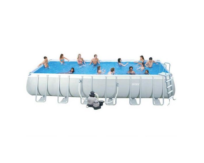 A group of people is swimming in a large, rectangular pool with a white fence surrounding it. The pool is filled with clear blue water, and there are several individuals floating on their backs, while others are swimming or standing. A lifeguard is seated at the end of the pool, observing the swimmers. The scene is set against a plain, light-colored background. | Intex Ultra Frame Pool 732 x 366 x 132 cm (set) | b8ef690f3acbae412c236d1ae138eeb612b805caae088215f79b8be7b938fe93 | 001229729921 | 0 | 0 | 62 | 11 | 0 | 0 | |