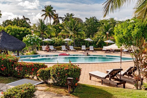 A serene outdoor swimming pool area surrounded by lush greenery and palm trees. The pool is circular with a white border and is filled with clear blue water. There are several lounge chairs with white cushions and umbrellas providing shade. A person is swimming in the pool, and another is standing near the edge. The surrounding area is adorned with vibrant red and green bushes, and the sky is partly cloudy. | Hotel Tibau Lagoa | 84a21c00c9b858522f9d3df4b2ba62d57862f480c967bd34d4b32fb17a8a9a32 | 001229730514 | 0 | 0 | 71 | 3 | 0 | 0 | |