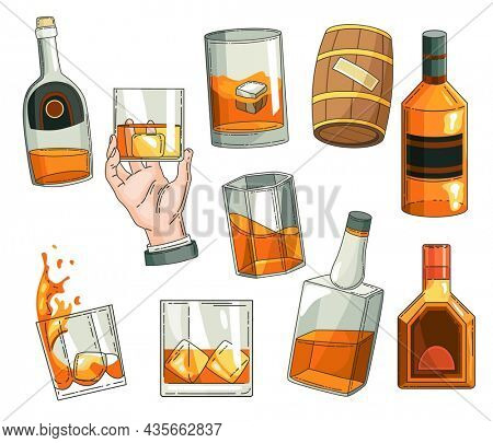 A collection of various types of liquor bottles and glasses, including a hand holding a glass with a cocktail, are arranged in a stylized illustration. The bottles and glasses are depicted in a cartoonish manner with exaggerated features and bright colors. The illustration includes a variety of liquor bottles with different shapes and labels, as well as glasses filled with a golden liquid that resembles a cocktail. The hand holding the glass is also stylized, with a simplified design and a neutral expression. | Whiskey advertising design elements. Advertising design symbols set. Glass bottle, man hand holding glass of scotch with ice cubes, wooden alcohol barrel icon collection. alcohol products | 8975d438bc8175b787d28a4f6cfad27deef0f3e8a564bb03b2c56f9bfe090223 | 001229730752 | 0 | 0 | 83 | 26 | 0 | 0 | |