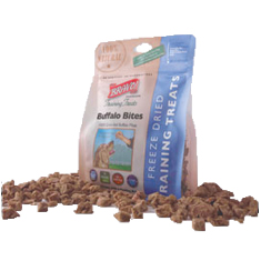 A bag of freeze-dried buffalo bites is shown with a pile of the same treats scattered around it. The bag is brown with a blue label and features a picture of a buffalo on the front. The treats are brown and appear to be in various shapes, resembling small cubes or bites. | Bravo Freeze Dried Buffalo Bites Training Treats | e7cd551600300fc56ece67c645120b0af1f3cebd7218bf20aa006094e6874f0e | 001229730682 | 0 | 0 | 52 | 7 | 0 | 0 | |