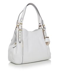A white handbag with gold accents on the handles and a small gold buckle on the front. The bag has a structured design with a flap top and a magnetic closure. It features a front pocket with a zipper and a side pocket with a snap closure. The interior is not visible in the image. | MICHAEL Michael Kors | White Bowery Large Shopper Bag | Lyst | 0543d0ede5cece579898f62aa36a93d1dbd8a141768c1d461f4d94ad7cf3abc4 | 001229731062 | 0 | 0 | 55 | 11 | 0 | 0 | |