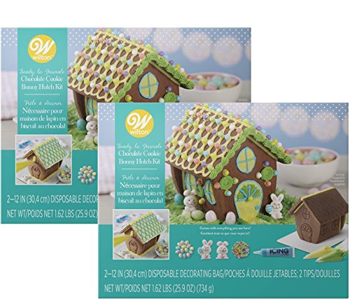 The image shows a set of three identical candy-themed recipe cards with a gingerbread house design. Each card has a teal background with a yellow border and a pattern of white dots. The gingerbread house is decorated with candy and icing, and there are candy decorations around it. The cards are placed on a surface with a white background, and there are two white bowls with candy pieces in the background. | Wilton Ready-to-Decorate Bunny Hutch Chocolate Cookie Kit 21 | 64b5d3ad8aff6c323cedc55443ee67aa2340610c17b9ee8c6e2e5b6410bb36af | 001229731039 | 0 | 0 | 71 | 8 | 0 | 0 | |