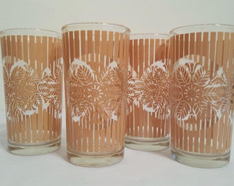 A set of four tall, clear glass cups with a floral pattern etched onto them. The glasses are arranged in a row, with the first glass on the left and the fourth glass on the right. The etched design features a symmetrical pattern of leaves and flowers, with a central circular motif. The glasses are placed against a white background, and the lighting casts a soft shadow to the right of each glass. | Striped Glasses Juice Glass Four Peach or Tan Floral Tumblers | 761c5928a38074582f5efc9ef68e2e826ce5911f5dff83f32746ed5b0f0fcfaf | 001229731023 | 0 | 0 | 73 | 10 | 0 | 0 | |