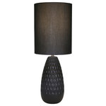 A modern lamp with a black shade and a textured black base is displayed against a white background. | Sagebrook Home - Ceramic 32" Eggcorn Table Lamp, Black - A stunning decorative table lamp to meet your basic fashion lighting needs. Showcasing a texture honeycomb design on the base in a oval shape, to top it off with a long black cylinder lamp shade. This elegant lamp will be a good addition to decorate your living space, with a Sleek and chic, this eye-catching style Base Material: Ceramic Shade Size: 12x18x15; Shape: Drum; Color: Cream; Material: Fabric Switch: 3-Way; Cord Color: Clear; Cord Length: 82.5 inches Number Of Lights: 1; Max Watts(per bulb): 150; Bulb Base: Bulb Base: E26;; Max Voltage: 110 Light Direction: Ambient Bulb not included. | 8ebc13a44a08c7ce68997dc4daa895dfcbd1f118979b89e0ca28e55e7b88d018 | 001229731021 | 0 | 0 | 18 | 109 | 0 | 0 | |
