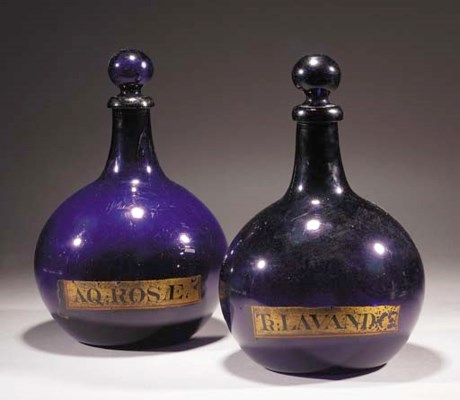 Two antique perfume bottles with ornate designs and labels are displayed on a white surface. The bottles are made of dark glass and have a glossy finish. The left bottle has a label that reads 'AQUOROSE' in a decorative font, while the right bottle has a label that reads 'BLAVANDOS' in a similar style. Both bottles have a cork stopper and are placed on a reflective surface, which creates a mirror-like effect. | Two amethyst pharmacy bottles | 2751e318a66b28afd1d4223cb2700d9a8c3fd2421ca96a051edb50cfccd11e98 | 001229731010 | 0 | 0 | 72 | 4 | 0 | 0 | |
