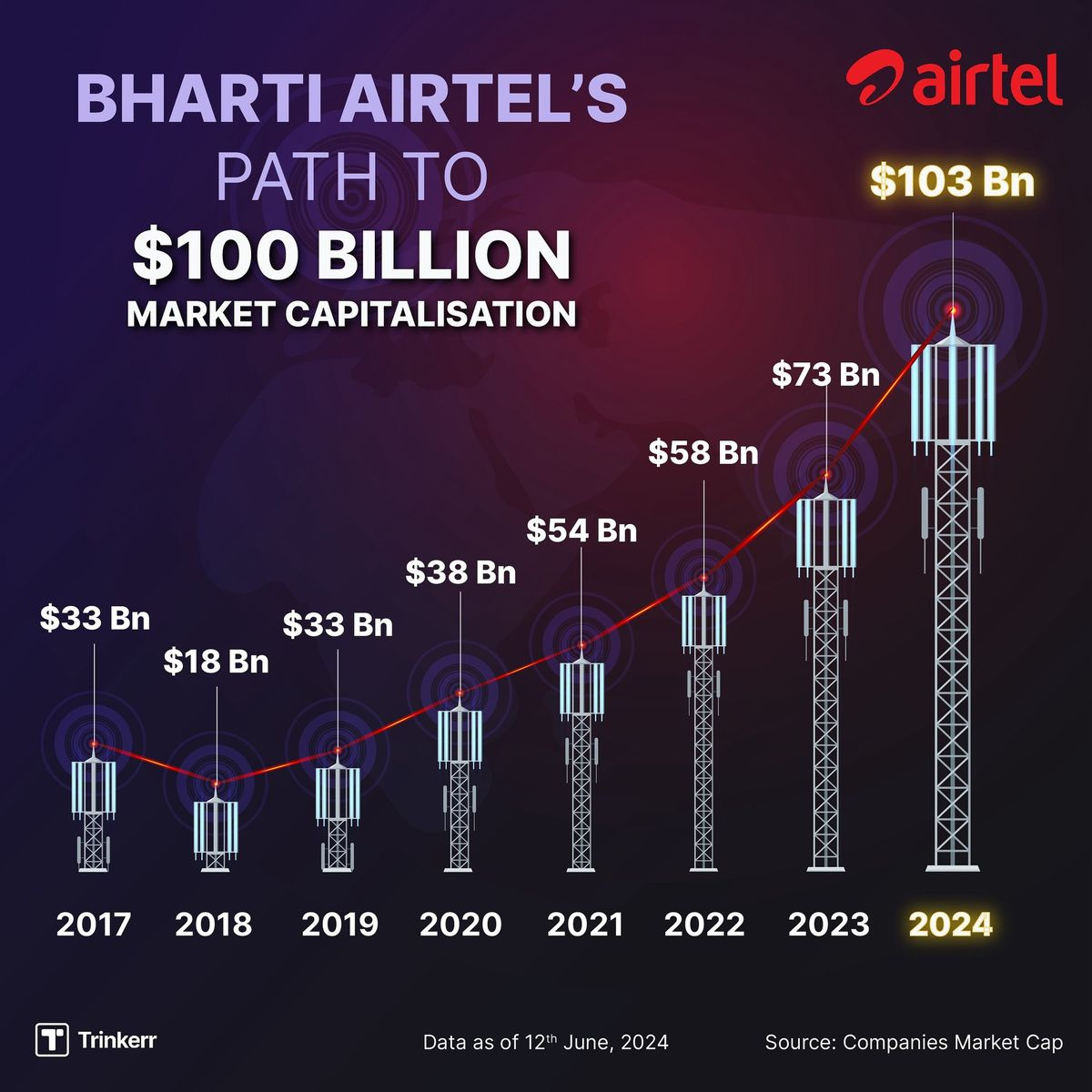 ] | Does Bharti Airtel in 2024 show a decrease compared to 2019? | No | * If the Bharti Airtel of 2024 is less than Bharti Airtel of 2019, your reponse should be 'Yes', otherwise 'No'.