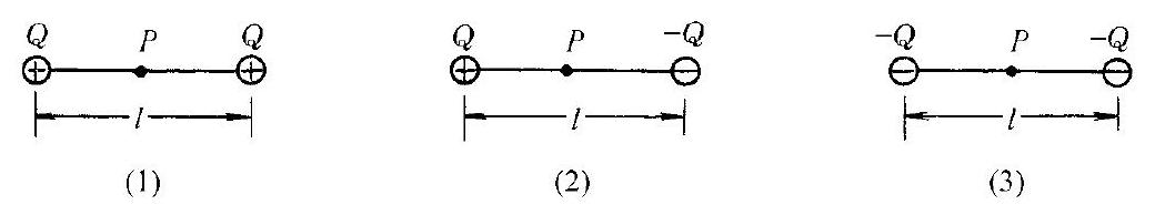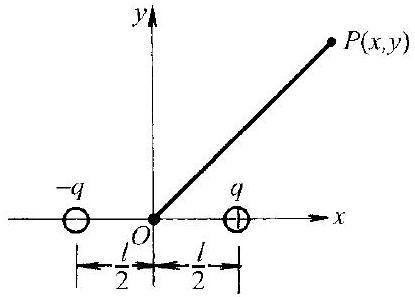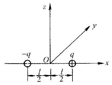 电荷量分别为 $q$ 和 $-q$ 的两个点电荷,相距为 $l$ ,以它们连线的中点